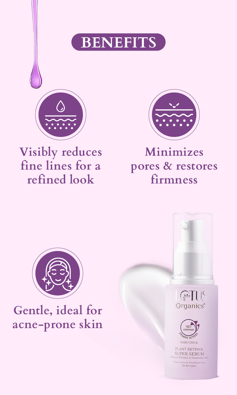 • Dispense two pumps to generously cover your face and neck. • Gently pat Bakuchoil Plant Retinol Super Serum on a clean & dry face. • Allow the product to absorb before applying other skincare products. • Follow it up with Bakuchoil Plant Retinol Night Recovery Crème.