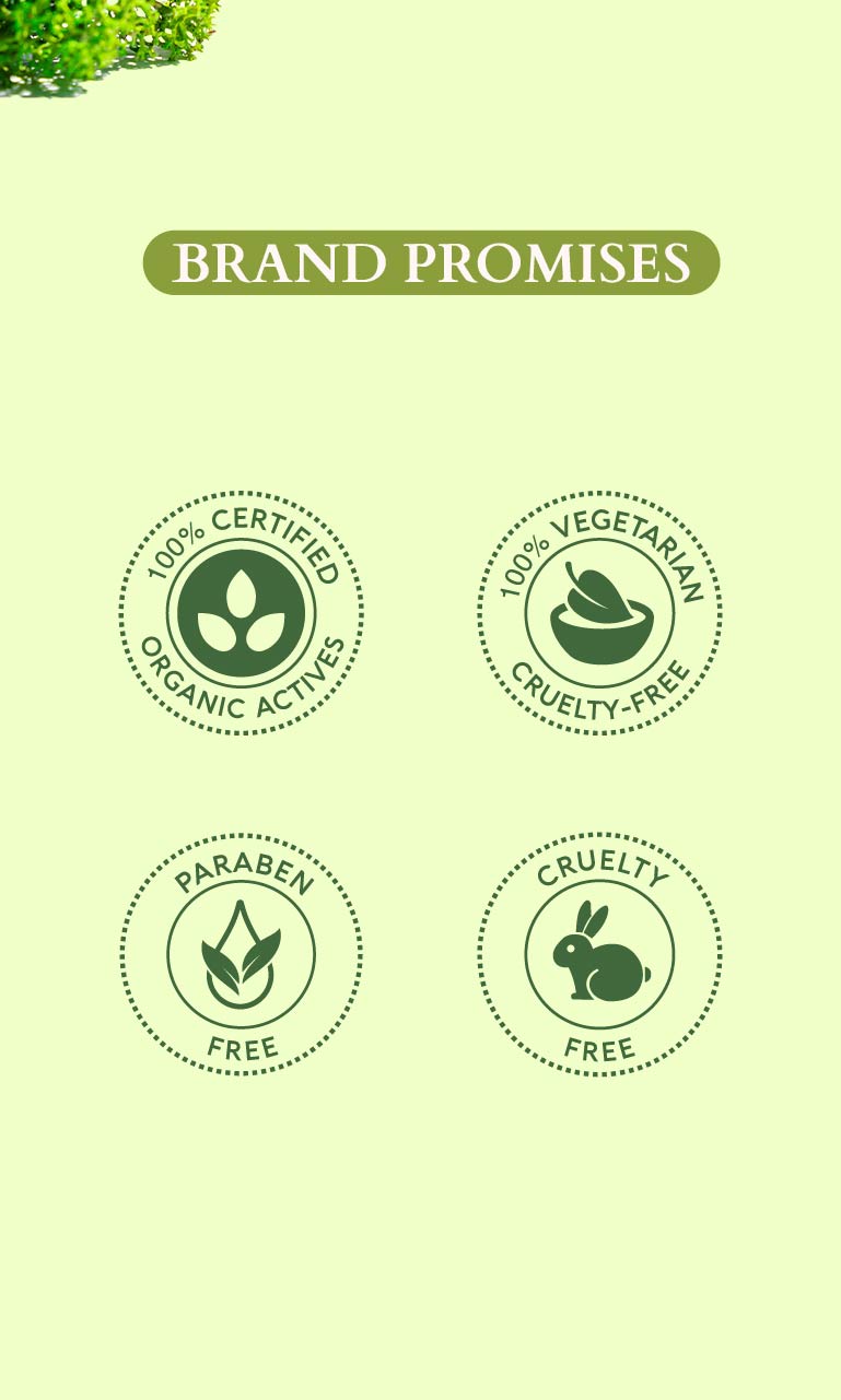 The promise of Purity:Vegan, Cruelty-free, Preservative-free, Sulphate-free, Paraben-free ; made with 100% Certified Organic Actives.