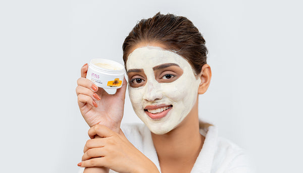 Cleanse your face to remove any makeup traces, dirt, and excess oil. On damp skin apply an even layer of Ubtan Face Mask.