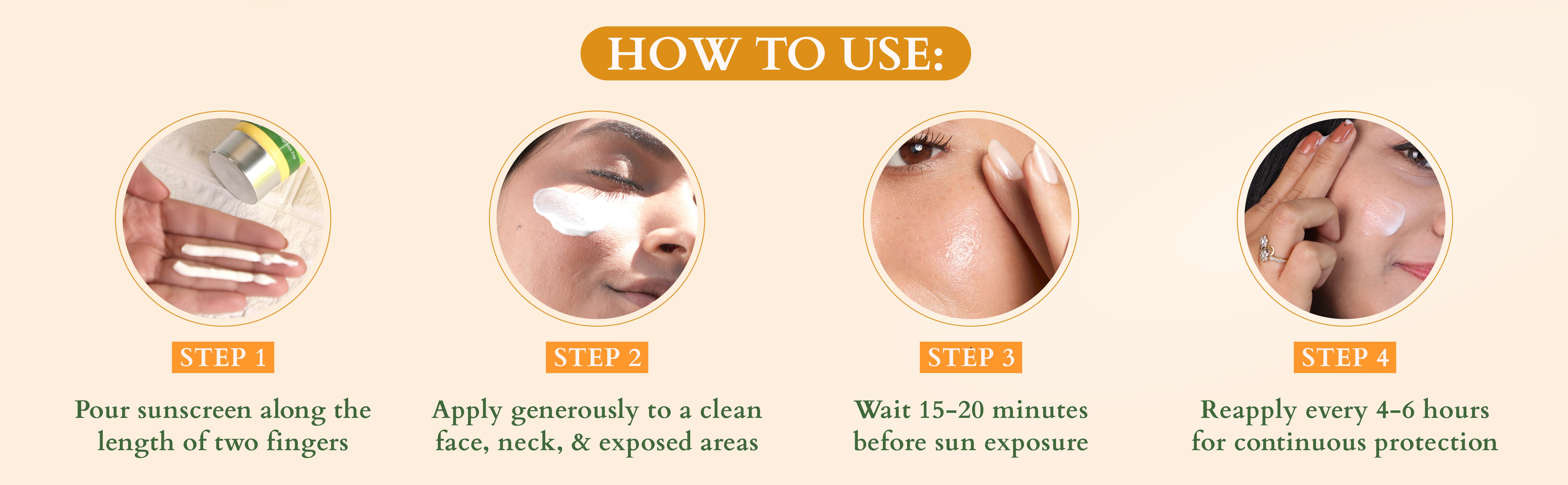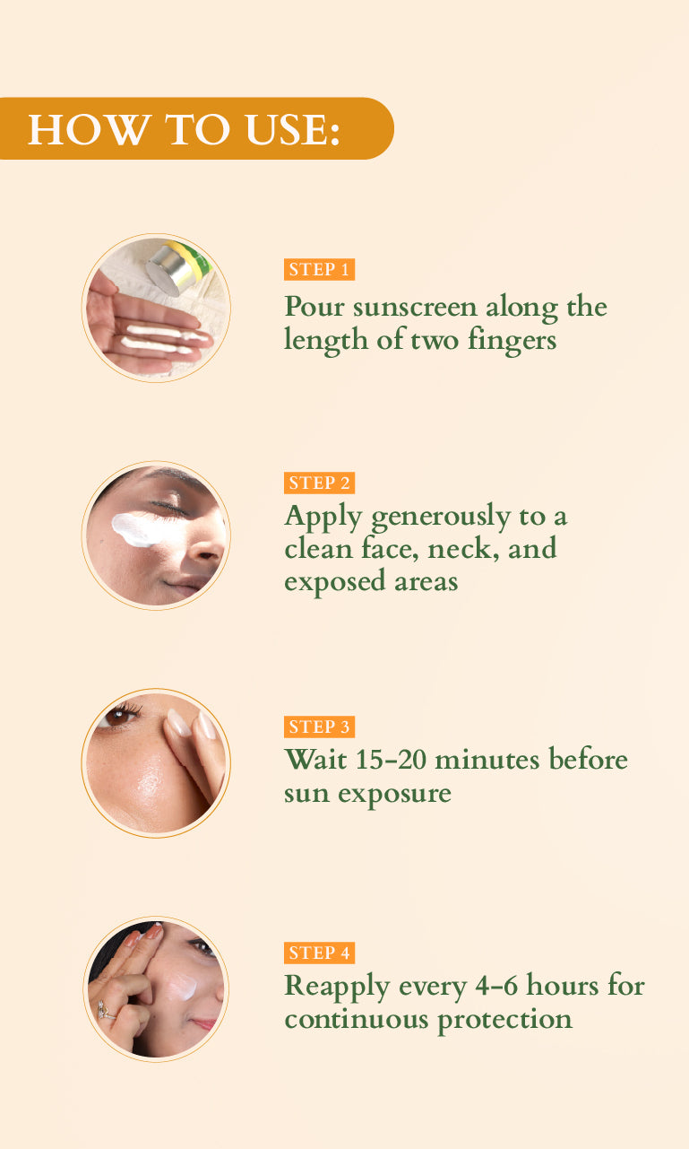 • Pour the sunscreen along the length of two fingers. • Apply liberally to a clean face, neck, and other exposed skin areas. • Wait 15 to 20 minutes before going outside in the sun. • To keep your skin protected and healthy, reapply every 4-6 hours.