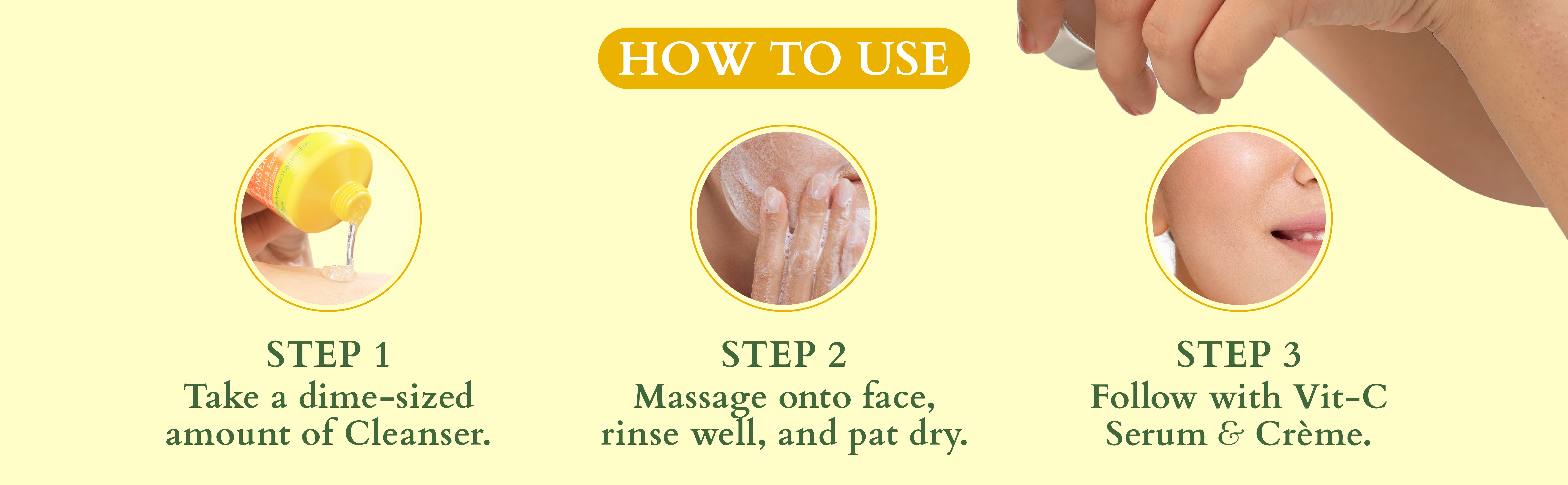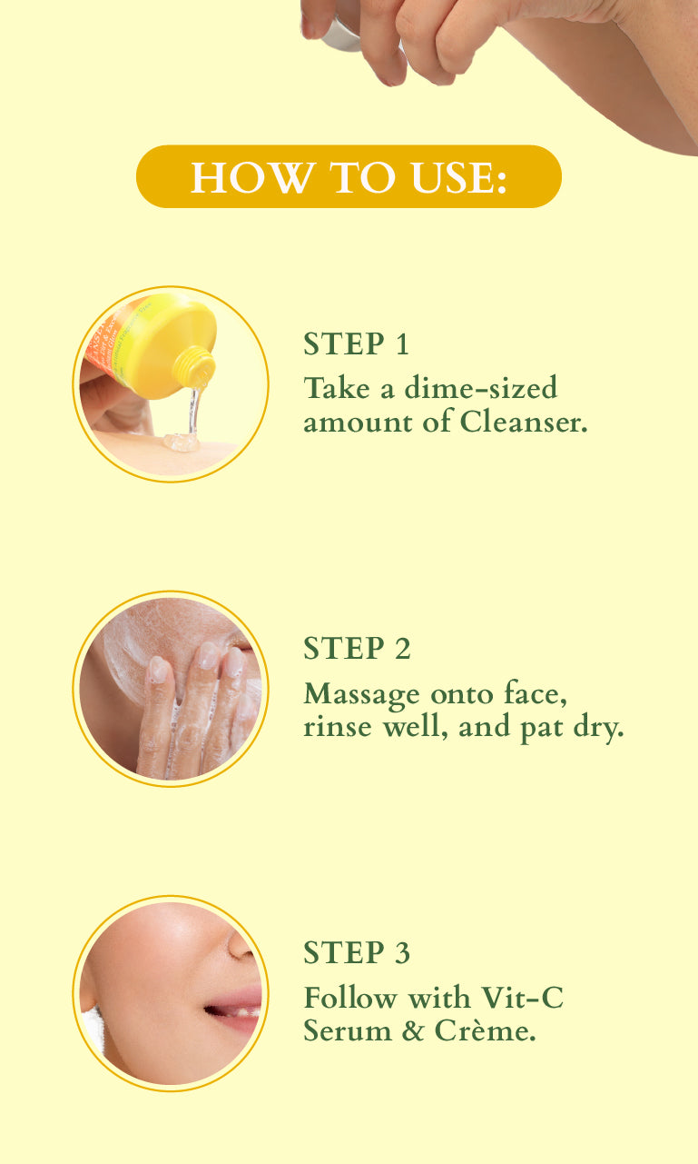 • Squeeze out a dime-sized Vit-C Radiance Booster Cleanser and work it between your palms to make a mild lather. • Gently massage it all over your face. • Rinse well with water. Using a clean towel, pat your face dry. • Follow it Vit – C Radiance Booster Serum & Crème SPF 20.