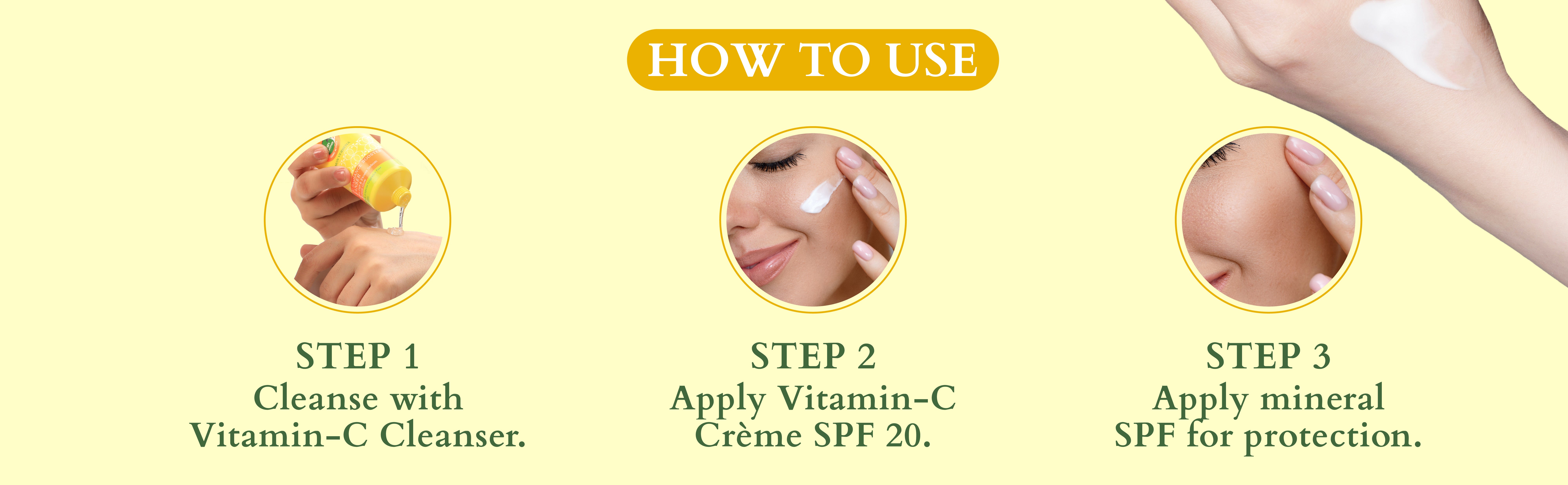 • Use Vit-C Radiance Booster Cleanser to cleanse your face. • Gently pat Vit-C Radiance Booster Crème SPF 20 into your forehead, cheeks, nose, and chin. • Massage the crème in an upward motion with your fingertips until it is completely absorbed. • Before going outside, apply a mineral SPF!